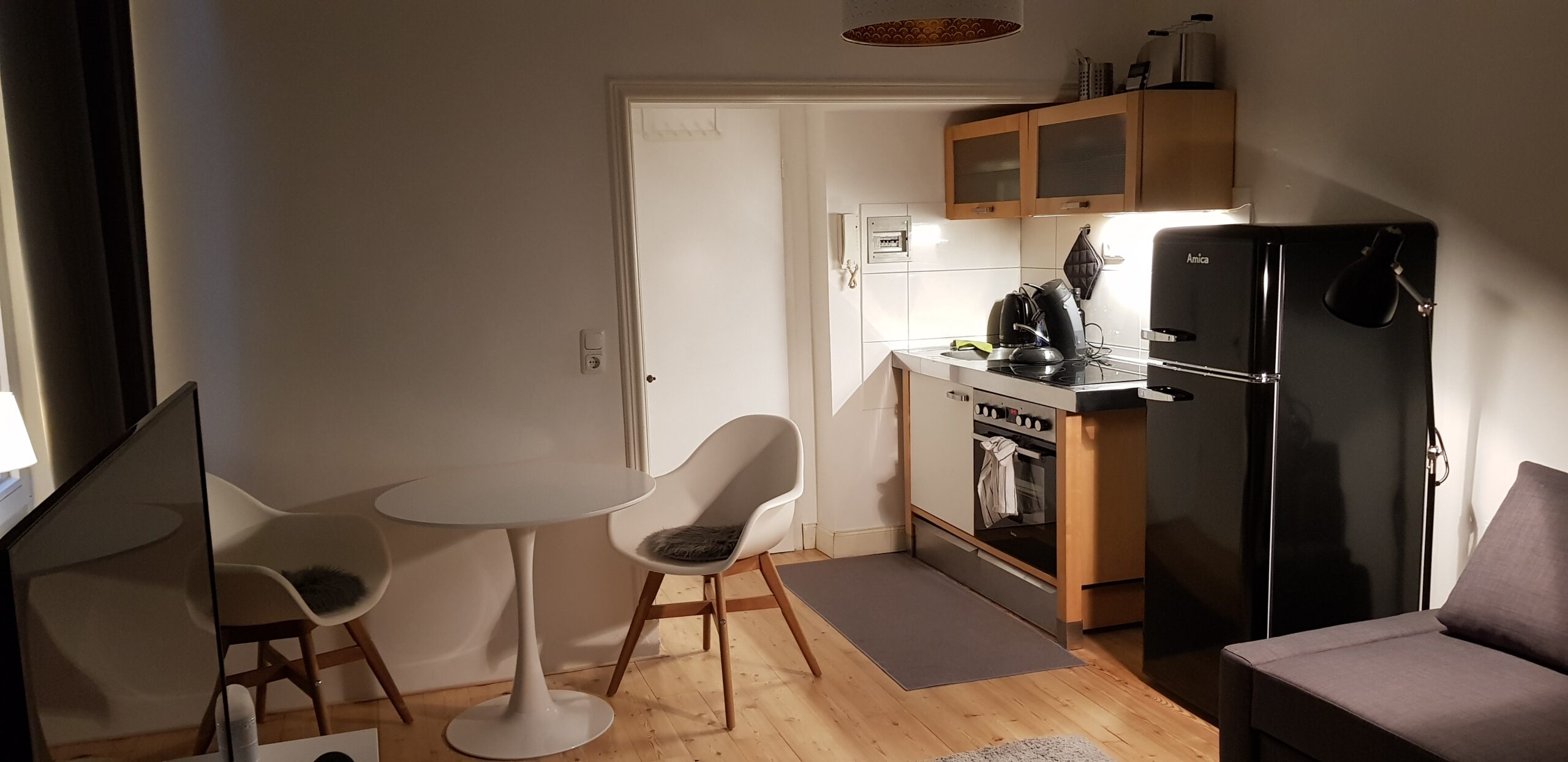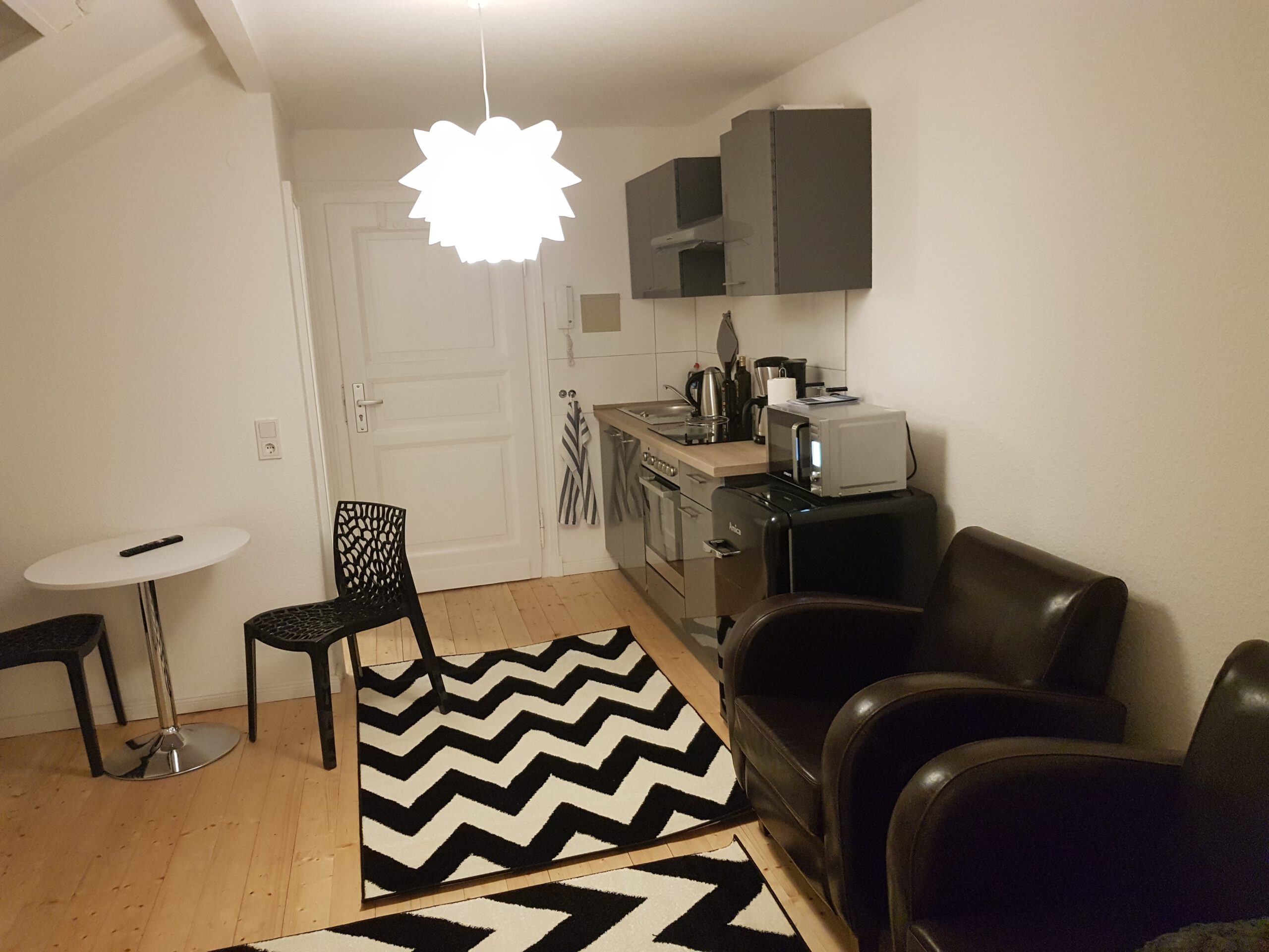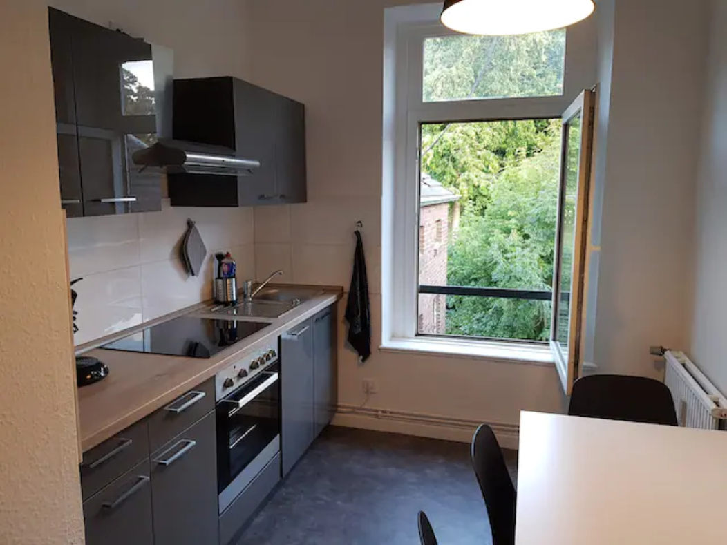 Ich biete insgesamt drei Wohnungen an. Zwei der Wohnungen sind im Hinterhaus eines denkmlageschützten Hauses (um 1900) . Es sind jeweils zwei Zimmer vorhanden, in dem einen befindet sich das Bett mit Schrank. In dem anderem ist die Küche und der Wohnbereich. Der Wohnbereich ist mit einem Fernseher und Sitzgelegenheiten ausgestattet. Die Küche hat alles was zum Kochen benötigt wird (Töpfe, Teller, Geschirr, Toaster, Kaffemaschine, Wasserkocher, Geschirrtücher usw.) Die dritte Wohnung ist im Vorderhaus und geht über zwei Etagen, sie hat ein Wohnzimmer und zwei Schlafzimmer. Zusätzlich besitzt die Küche eine Spülmaschine. Die Wohnungen sind frisch saniert, letztendlich ist alles neu.